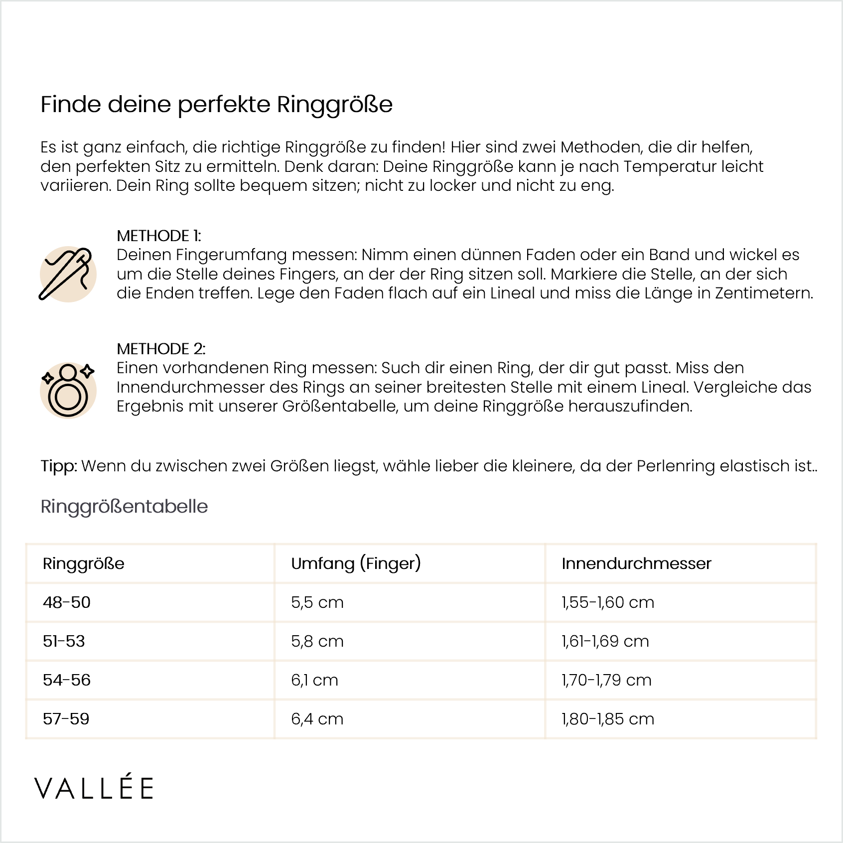 Der elastische Perlenring ist ein Allrounder für jeden Anlass. Im Alltag sorgt er für dezente Eleganz, kombiniert mit Jeans oder einer schlichten Bluse. Zu festlichen Outfits wie einem Abendkleid oder Business-Look setzt er stilvolle Akzente. Dank seines elastischen Designs ist er angenehm zu tragen und lässt sich perfekt mit anderen Vallée-Schmuckstücken kombinieren.