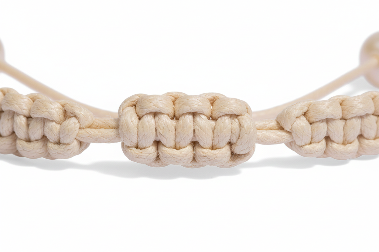 Der Makramee-Schiebeverschluss ermöglicht eine stufenlose Größenverstellung und passt sich flexibel dem Handgelenk an. Durch die handgeknüpfte Technik lässt sich das Armband einfach enger oder weiter ziehen, sitzt sicher und bietet hohen Tragekomfort bei zugleich natürlicher, handwerklicher Optik.